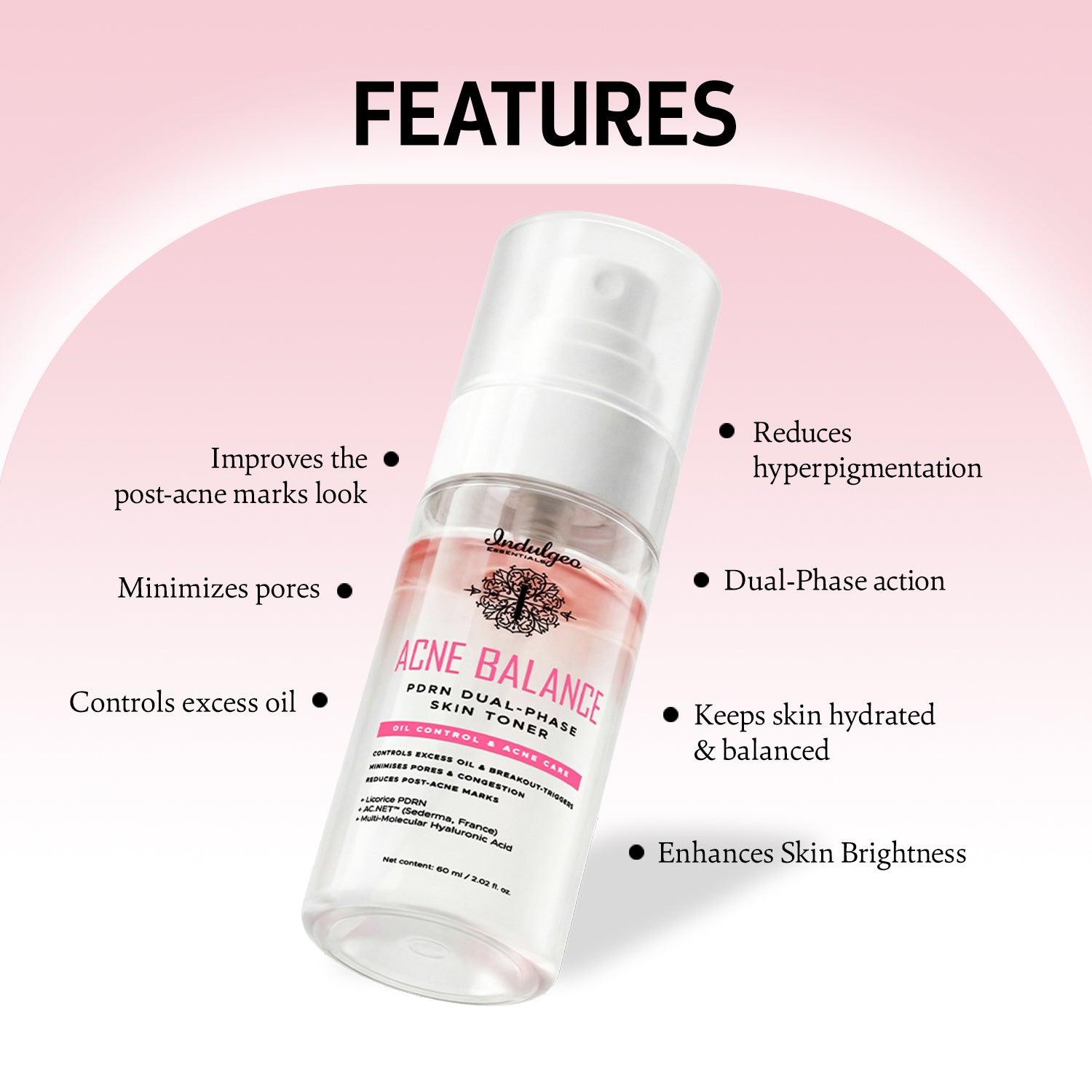 A: Indulgeo Essentials Acne Balance PDRN Dual-Phase Skin Toner uniquely blends Licorice PDRN for skin renewal and AC.NET™️ for sebum regulation.