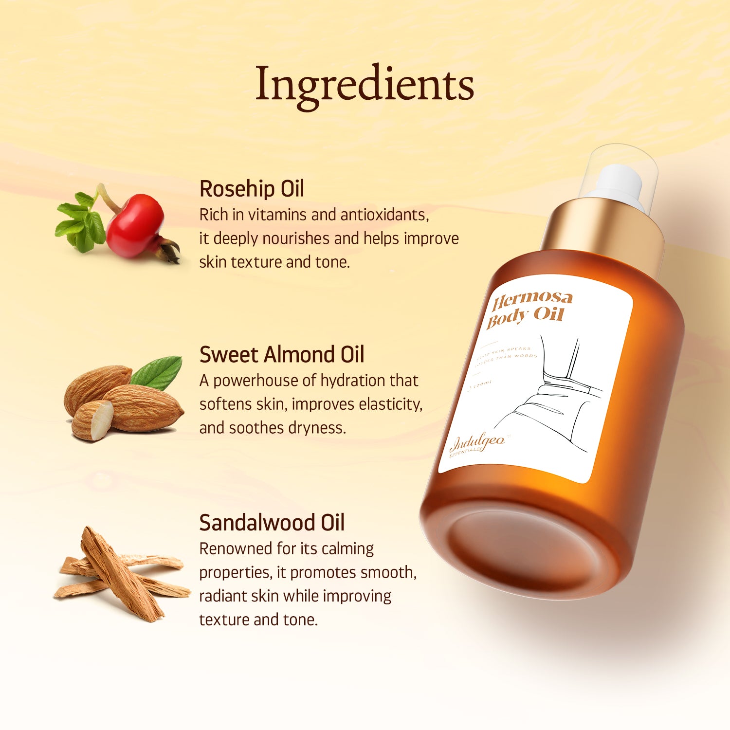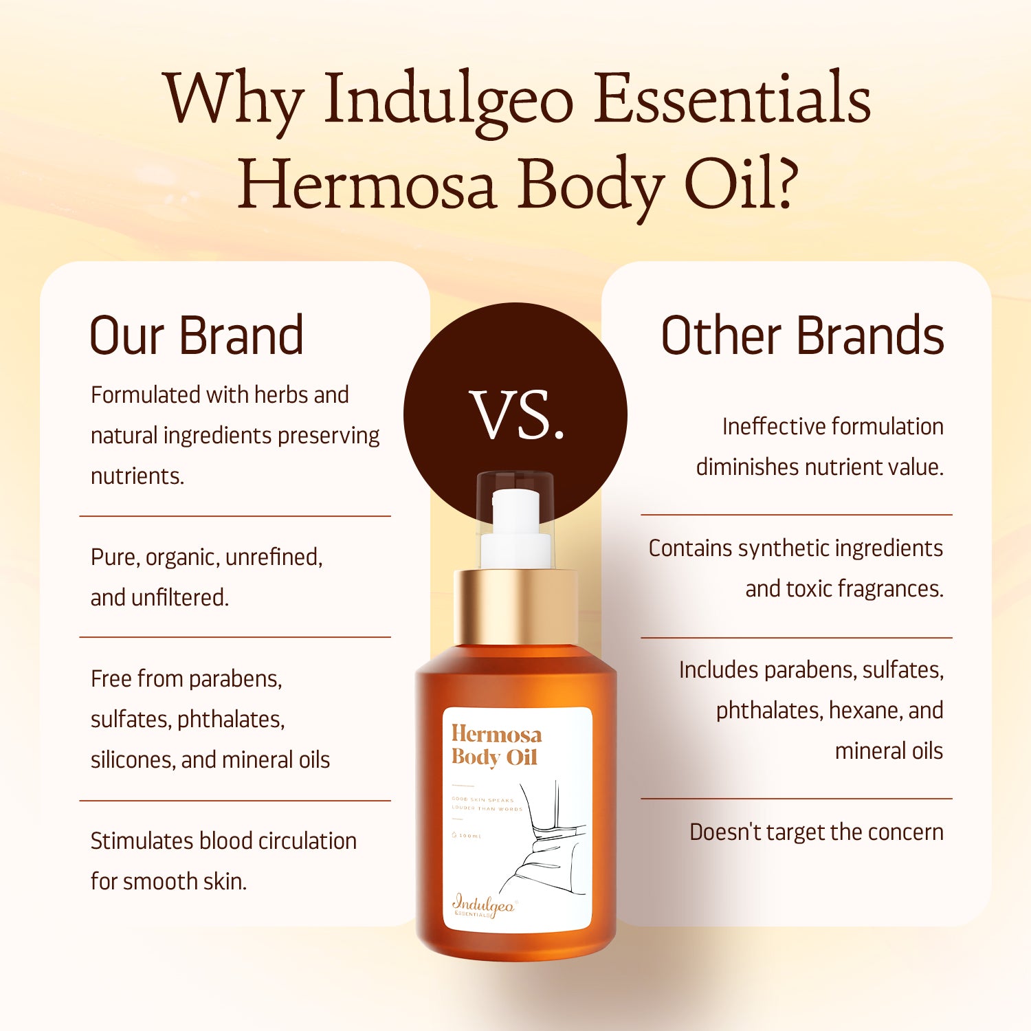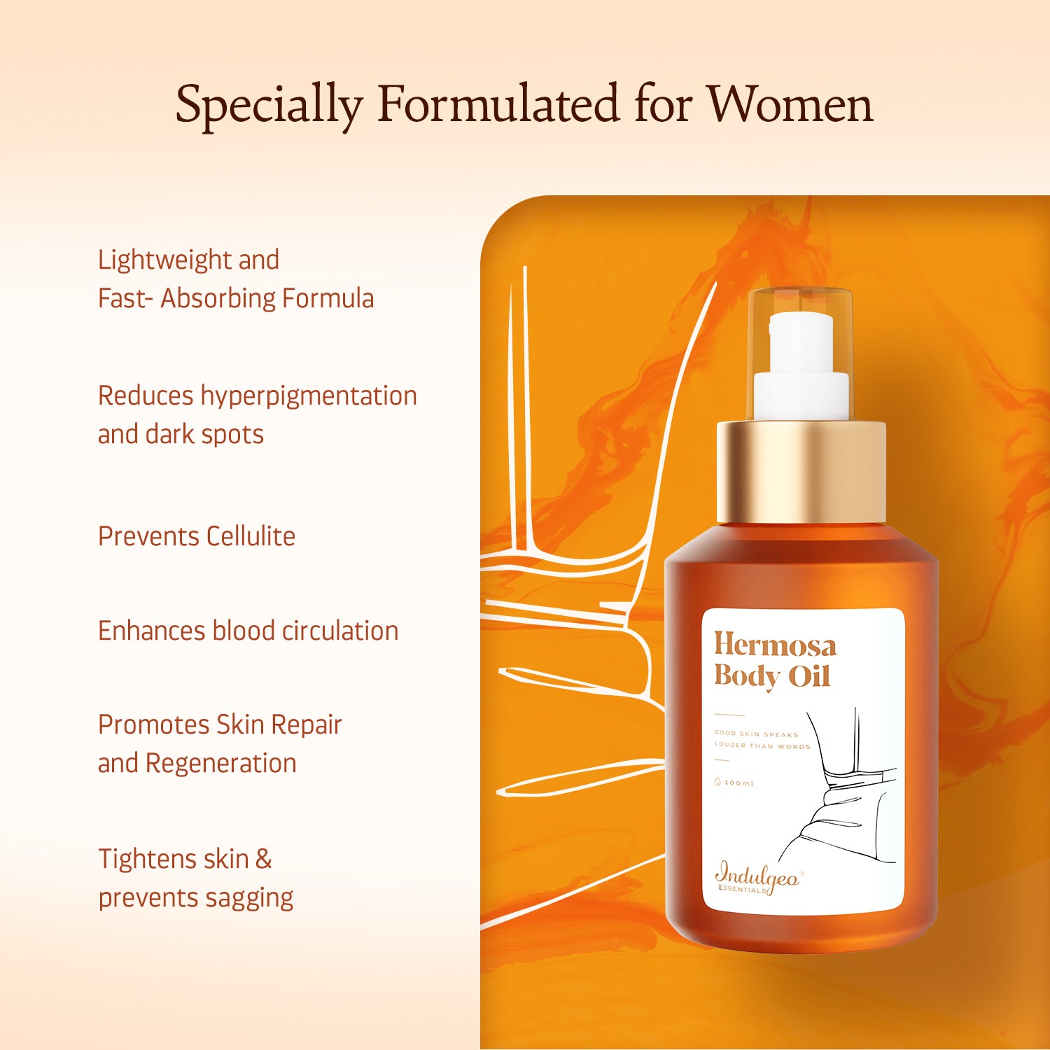 Hermosa Body Oil was specially formulated for women of the age of 21 and above. It was designed as per the requirements of the dermal layer of the skin of an ageing woman and the kind of moisturization they need. An eleven-year-old inspired the creation of the Blooming Body Oil. Sahria Malik, Daughter of Supriya Arora Malik, was born with an unique gene that causes her to be allergic to glucose and develops a rash every time she consumes anything sweet that is first red but subsequently turns black, causing pigmentation all over her body. After visiting various dermatologists, the founder decided to treat her with an ointment that had 5% hydroquinone acid. The mother of the founder and the brains behind the brand, Seema Arora was never in favour of using such harsh chemicals especially on such a young child. Hydroquinone has numerous adverse effects, including skin irritation, especially if sun protection is not used after application, as well as a seldom seen blue discolouration known as 'ochronosis'. At greater concentrations, there is a possibility of losing too much pigment, resulting in white patches. She then decided to create a concoction for her granddaughter that would help with her pigmentation as well as treat any rashes that developed. After researching for a couple of months, she created the Blooming Body Oil. She named it Blooming Body Oil because she believed that when her granddaughter would use this concoction she would bloom in her early teenage years. It took the brand 4 years to launch this product because of its high pricing. The contemplation of the product reaching the masses and helping them was the main concern that the team of Indulgeo had. However, we believed that it is absolutely essential for everyone to witness the wonders of nature, therefore we launched this product along with its versions, Hermosa Body Oil and Hermoso Body Oil. Since, the dermal layer of the skin varies from age to age and from gender to gender, it was important for us to come with the variants and make the concoction stronger as per the age and gender.