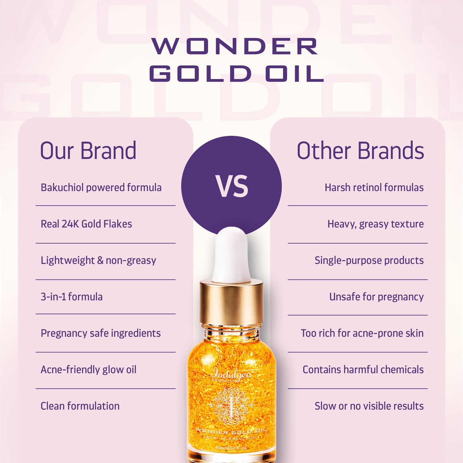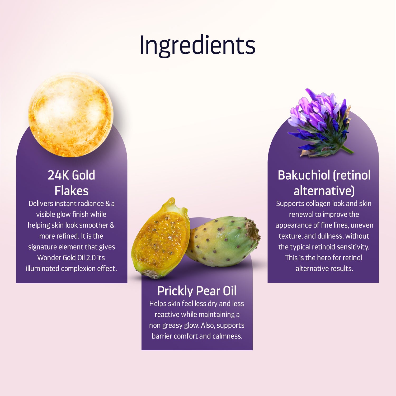 24k Gold flakes***, Grapeseed Oil (Vitus vinifera)** , Prickly Pear Oil (Opuntia ficus indica Seed Oil)**, Chamomile Oil (Matricaria chamomilla)*, Wild Rose Bush Oil (Rosa moschata)*, Carrot Seed Oil (Daucus carot)*, Lily Oil (Lilium)*, Sandalwood (Santalum Album Extract)*, Red Raspberry Oil (Rubus idaeus extract)*, Lotus Extract (Nelumbo nucifera)***, Bakuchiol***, Geranium (Geraniaceae Extract)*, Rosa and other plant extracts***