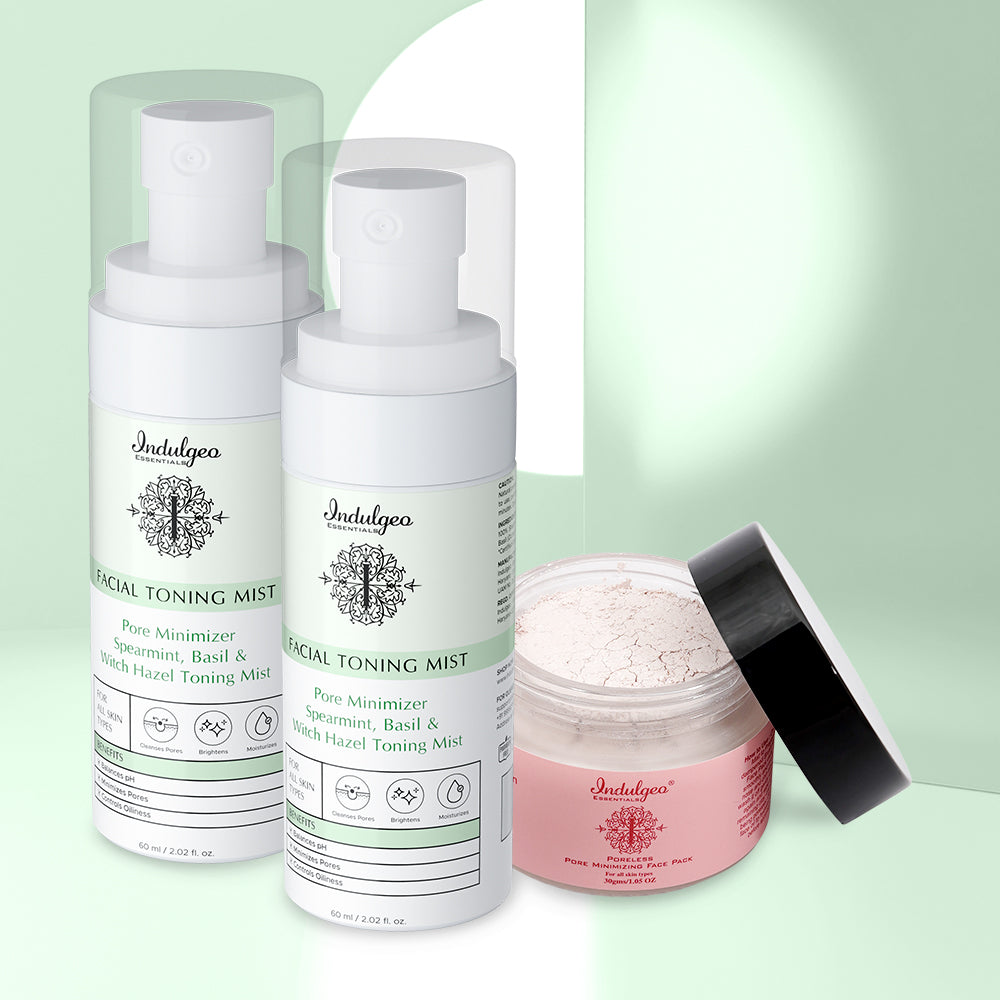 This is a knight in shining armor combo for getting rid of the irksome black and whiteheads. The Spearmint & Basil Pore Minimizer Toning Mist balances your pH level of the skin whilst controlling hormonal acne, and the Poreless Pore Minimizing Face Pack helps you say goodbye to your open and large pores.