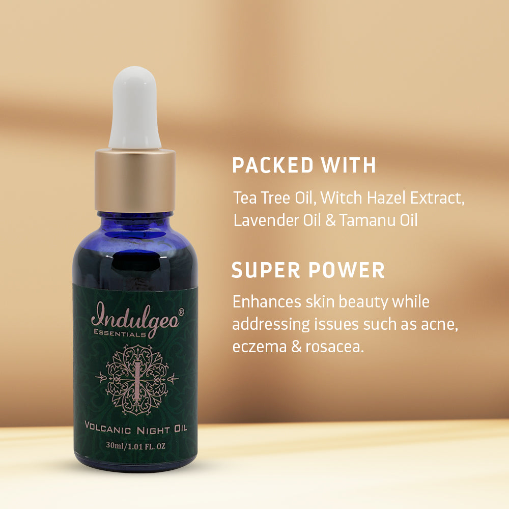 Volcanic Night Oil has been a part of Indulgeo's roll of Honour for many years now. It has been a favourite amongst people with Oily Acne Prone skin as it does so much with just a few drops. The lightweight texture of the oil was decided, keeping in mind the needs of the clients. It has proved to be an effective product from teenagers to adults. Not only does this product help improve acne, but it also controls sebum production due to the presence of Witch Hazel.