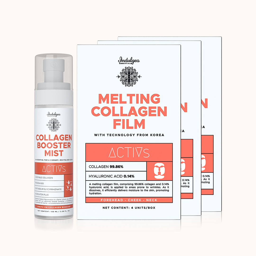 Let the Collagen Film absorb by Spraying Indulgeo's Collagen Booster Mist. Finish with a Final Mist for a Refreshing Touch.