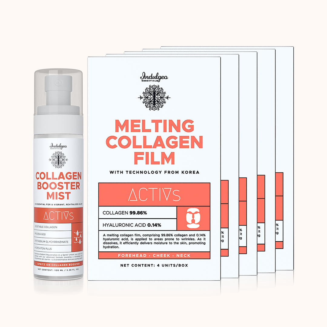 Let the Collagen Film absorb by Spraying Indulgeo's Collagen Booster Mist. Finish with a Final Mist for a Refreshing Touch.