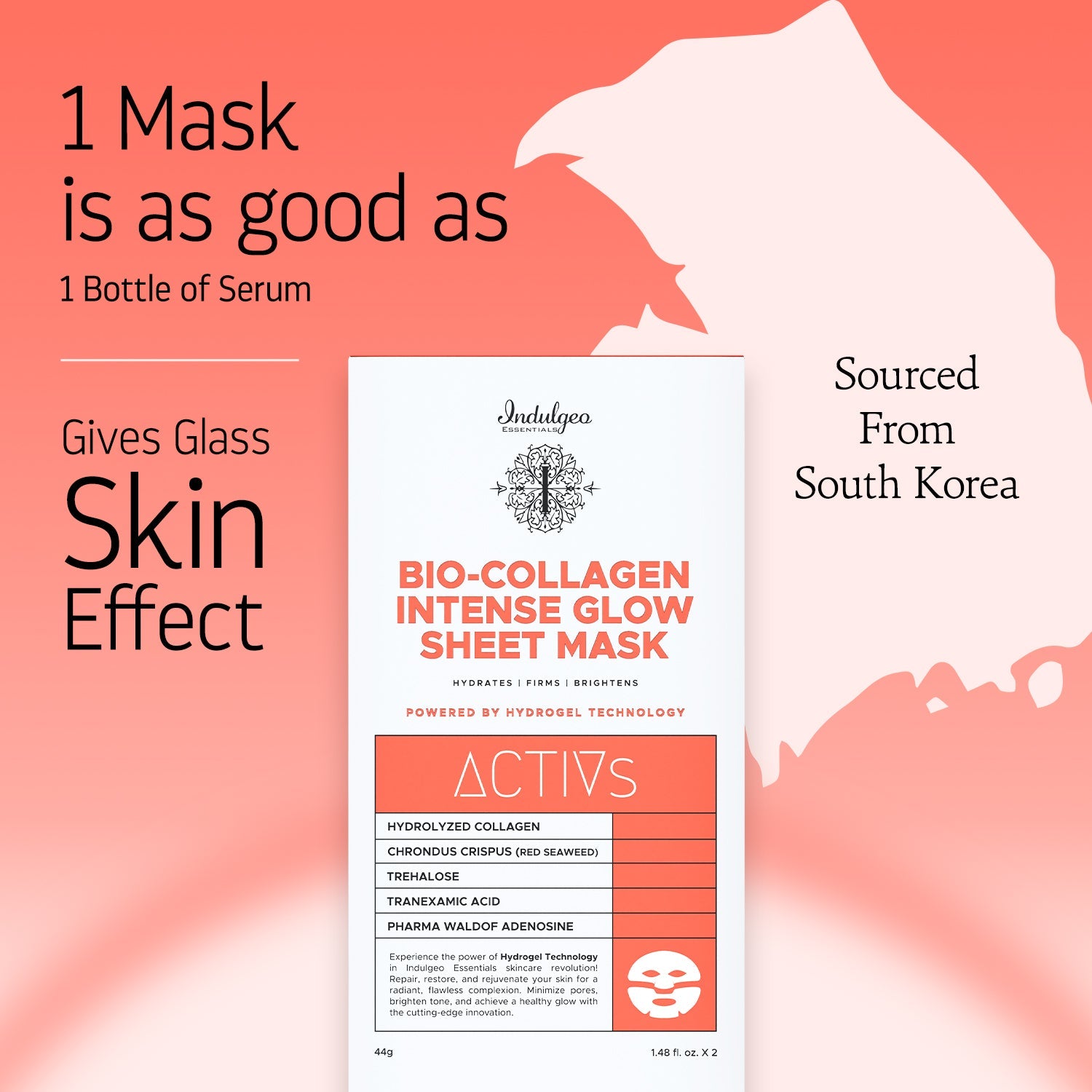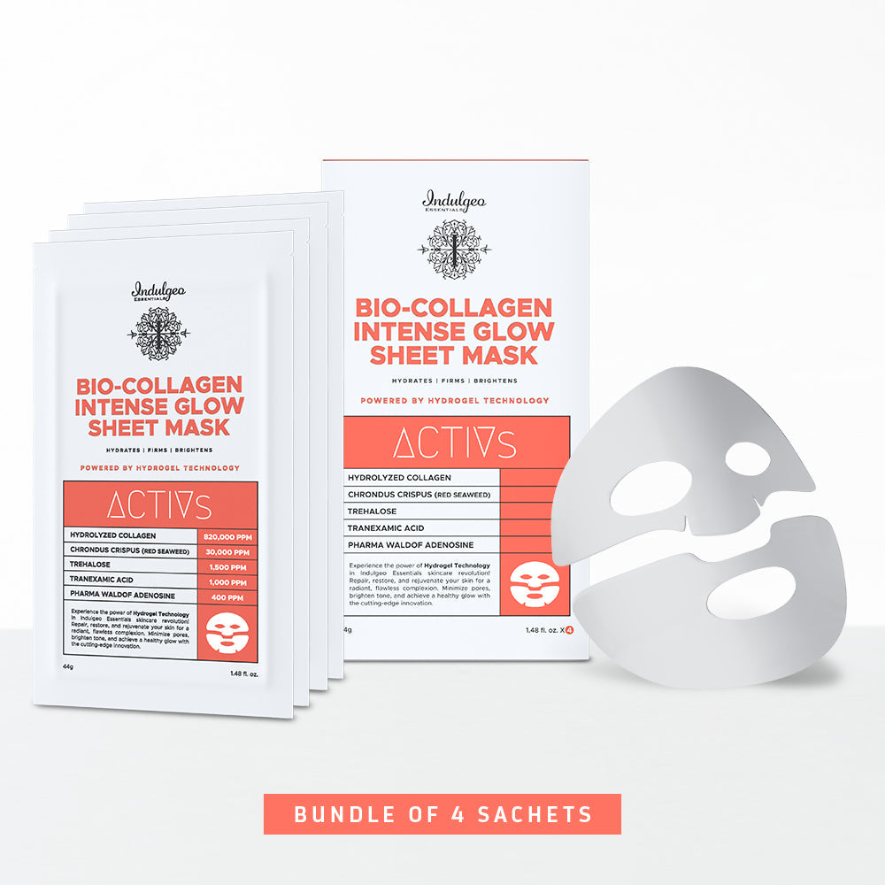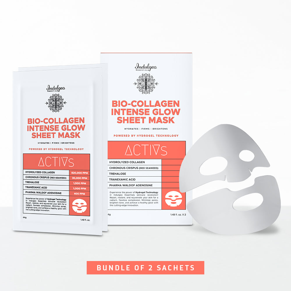 Discover the rejuvenating power of Indulgeo Essentials Bio-Collagen Intense Glow Sheet Mask, meticulously formulated for hydration and renewal. Utilizing advanced Korean hydrogel technology, this mask ensures potent ingredients penetrate deeply for optimal effectiveness.