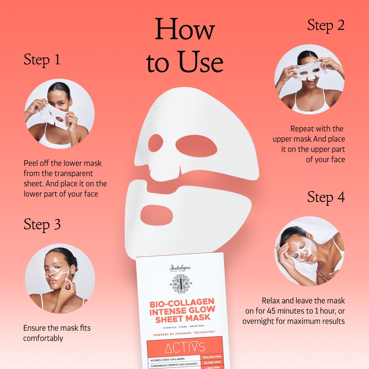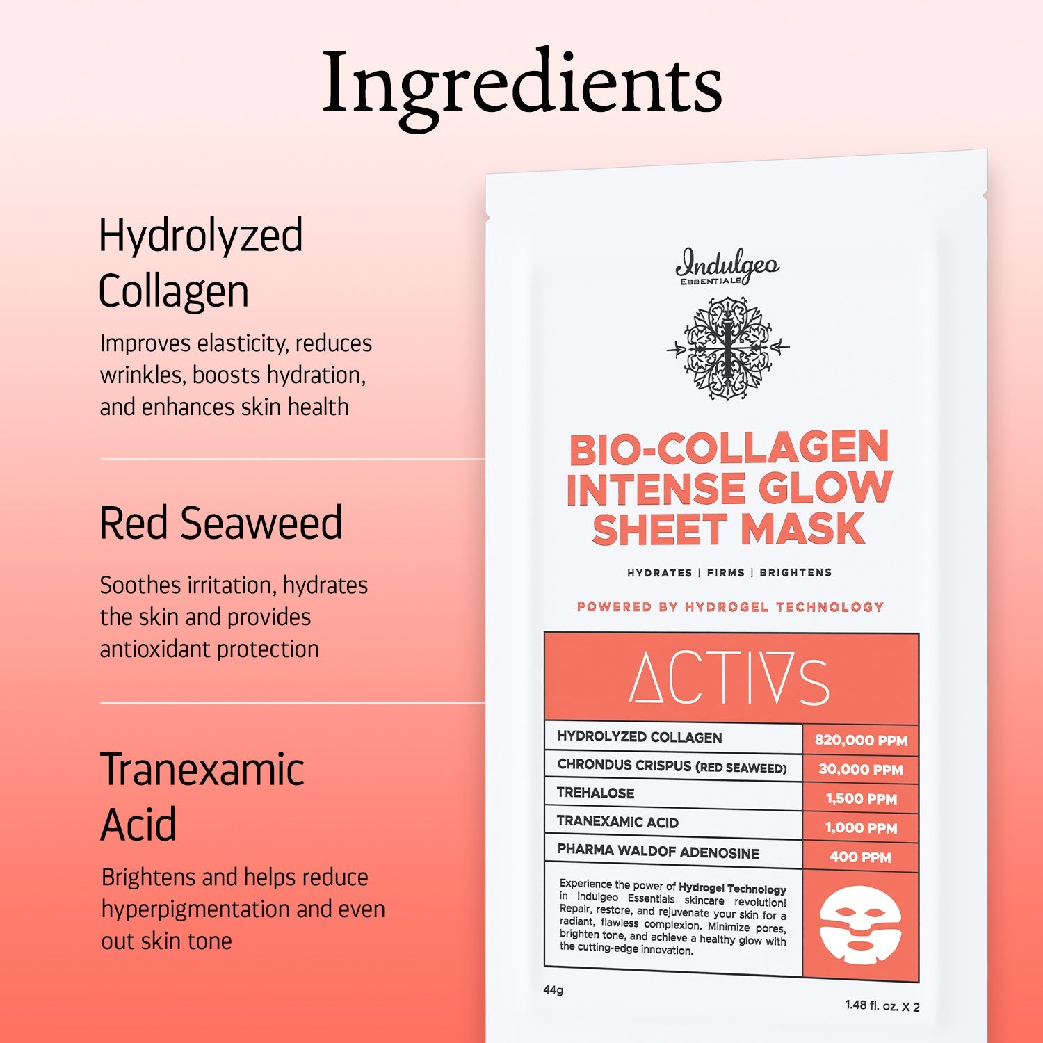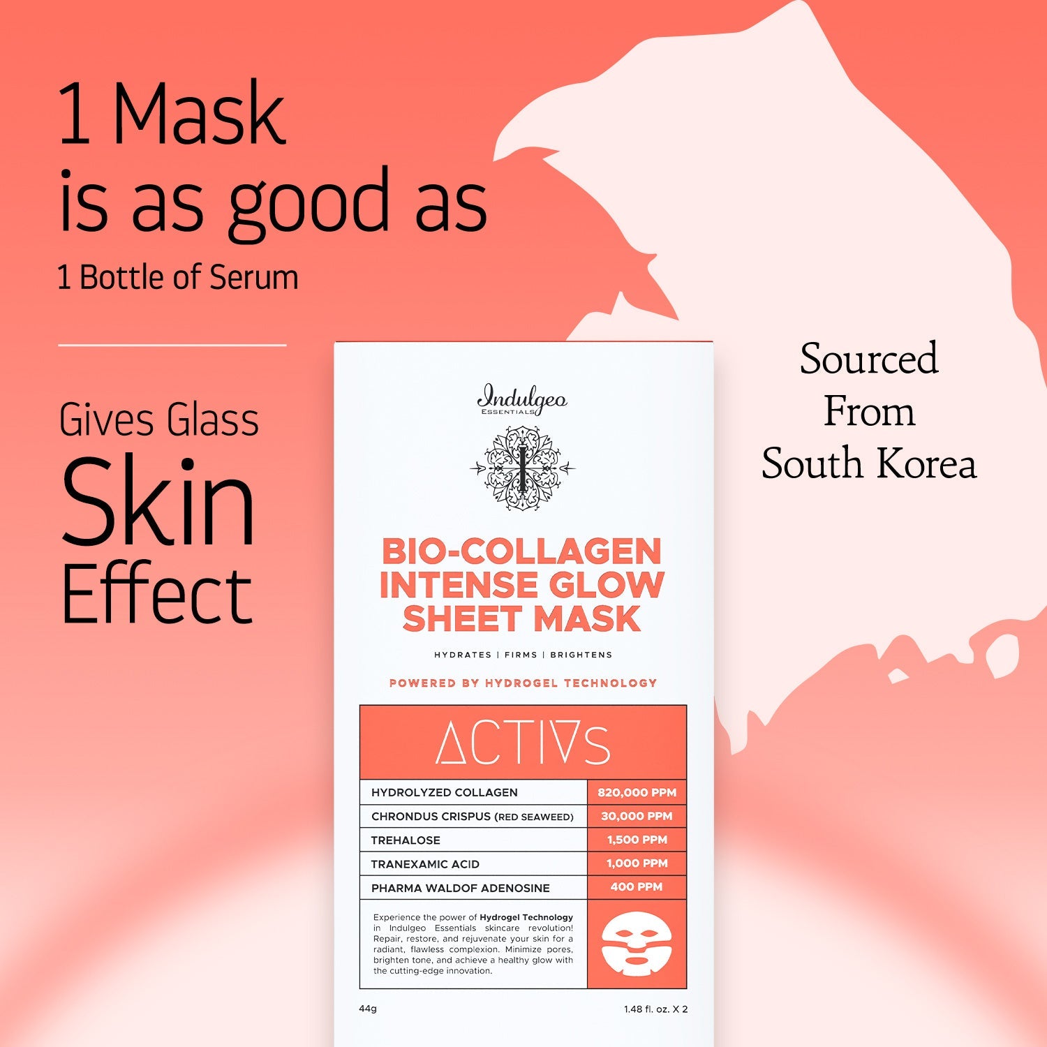 Discover the rejuvenating power of Indulgeo Essentials Bio-Collagen Intense Glow Sheet Mask, meticulously formulated for hydration and renewal. Utilizing advanced Korean hydrogel technology, this mask ensures potent ingredients penetrate deeply for optimal effectiveness.