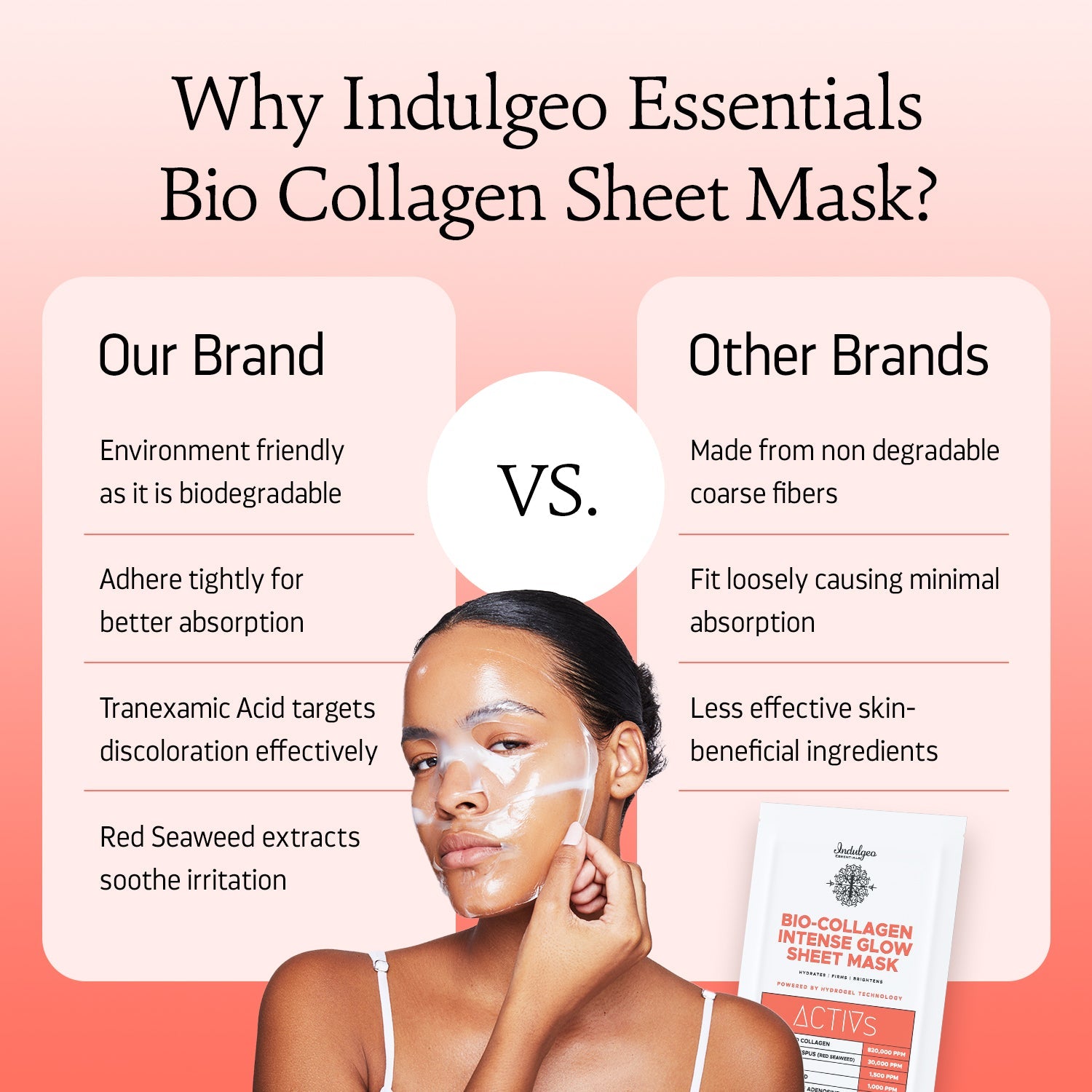 Elevate your skincare routine with Indulgeo Essentials Bio Collagen Sheet Mask, a luxurious treatment that addresses skin recovery, firming, hydration, pore minimization, barrier repair, and enhanced radiance. This innovative mask turns transparent after 2-3 hours of application, indicating that it has effectively delivered its benefits. Reveal a healthy, youthful, and radiant complexion with every use. Embrace the ultimate skincare experience and let your natural beauty shine through.