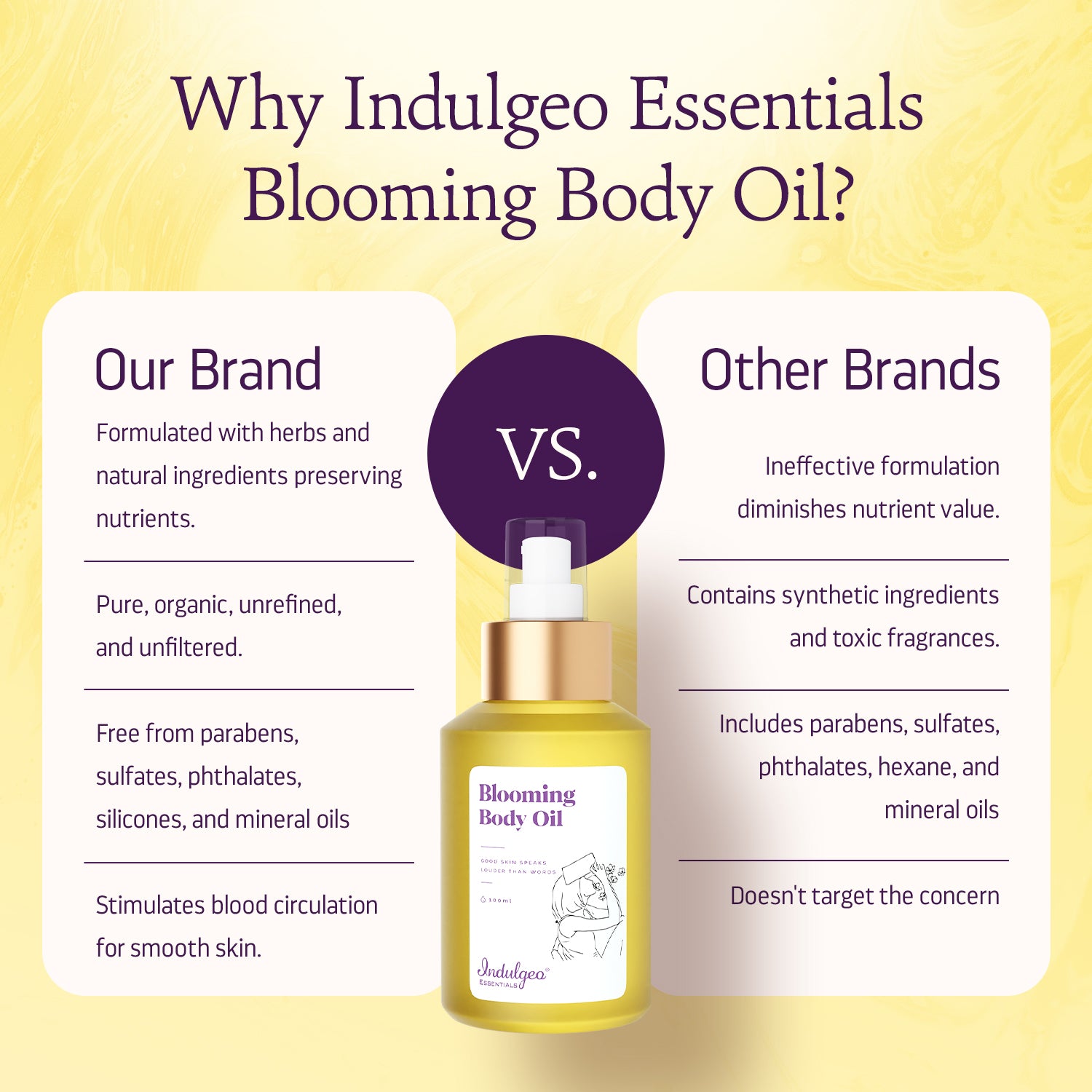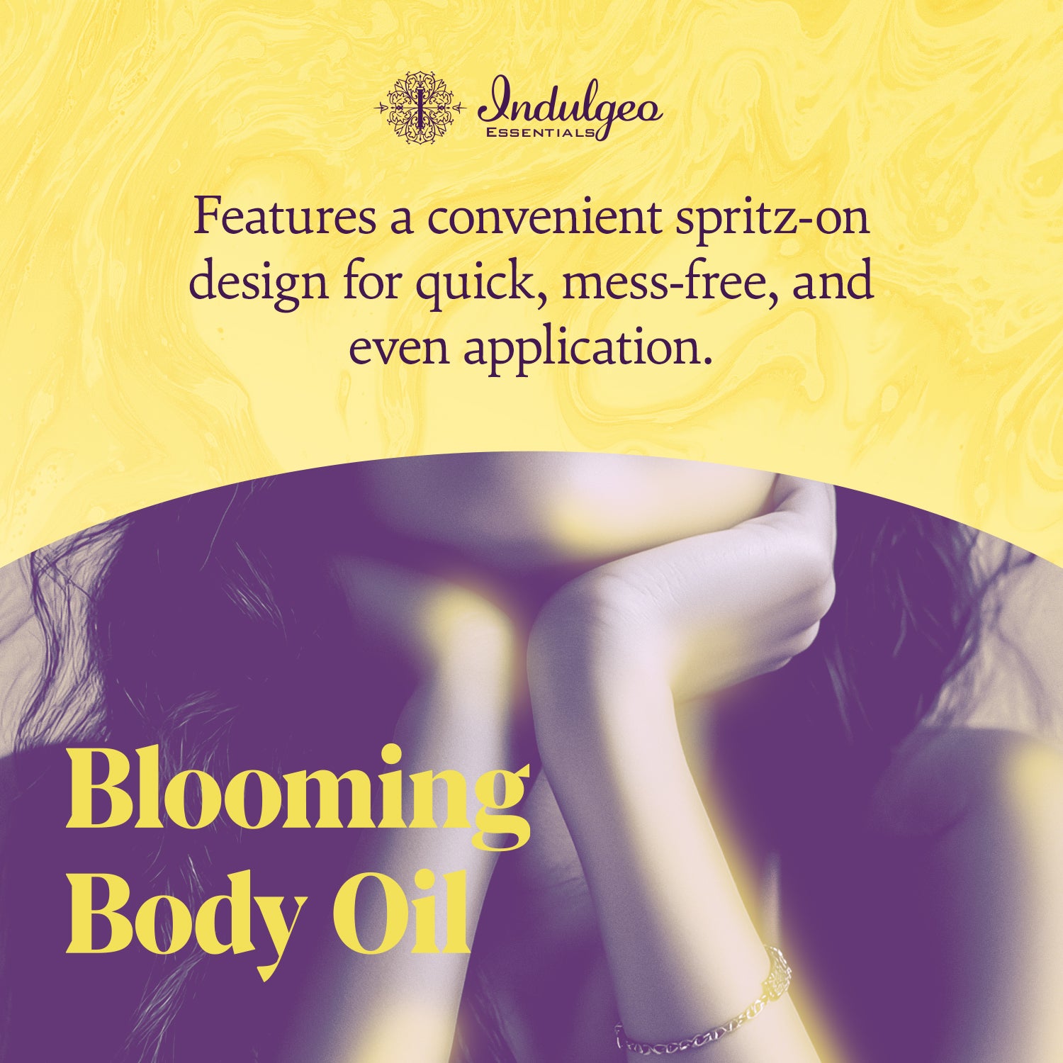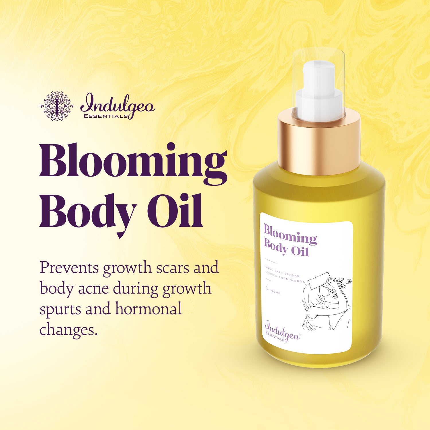 The Indulgeo Essentials Blooming Body Oil is a silky luxurious hydrator that makes spritz-on hydration a breeze. This body oil is the ultimate best friend for growing children, especially during growth spurts and hormonal changes. It is designed to make the transition beautiful and easy for all, and helps in avoiding growth scars and body acne that may develop. This body oil makes skin look immensely smooth year-round, and usage on a daily basis helps lock in sublime moisture into the skin, leaving it soft and supple. The illuminating fast-absorbing formula helps restore moisture & eliminates any signs of dryness, damage, & dullness. Made with the highest quality skin-loving botanical oils like Indian Tulsi, Bearberry Extract, Wheat Germ Oil, blended with Extra Virgin Olive Oil & Olive Squalane, this body oil provides a boost of nutrients that promote skin cell regeneration, tighten skin, improve skin elasticity, reduce hyperpigmentation while promoting blood circulation. This Blooming Body Oil is perfect for moisturizing delicate skin and can be used as a Body Oil for kids or a Kid Massage Oil for a soothing and hydrating experience. It is gentle and safe for all skin types, including babies, making it the ideal Baby Body Massage Oil to keep your little one's skin soft and nourished. Is body oil safe for kids? Absolutely! The Blooming Body Oil is formulated with natural and safe ingredients, making it a wonderful option for daily use on children’s skin to help maintain softness and promote healthy skin. Use the Blooming Body Oil regularly to keep skin hydrated, radiant, and smooth, while also benefiting from its skin-enhancing nutrients.