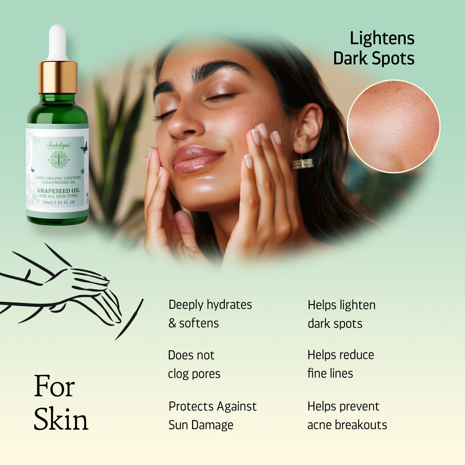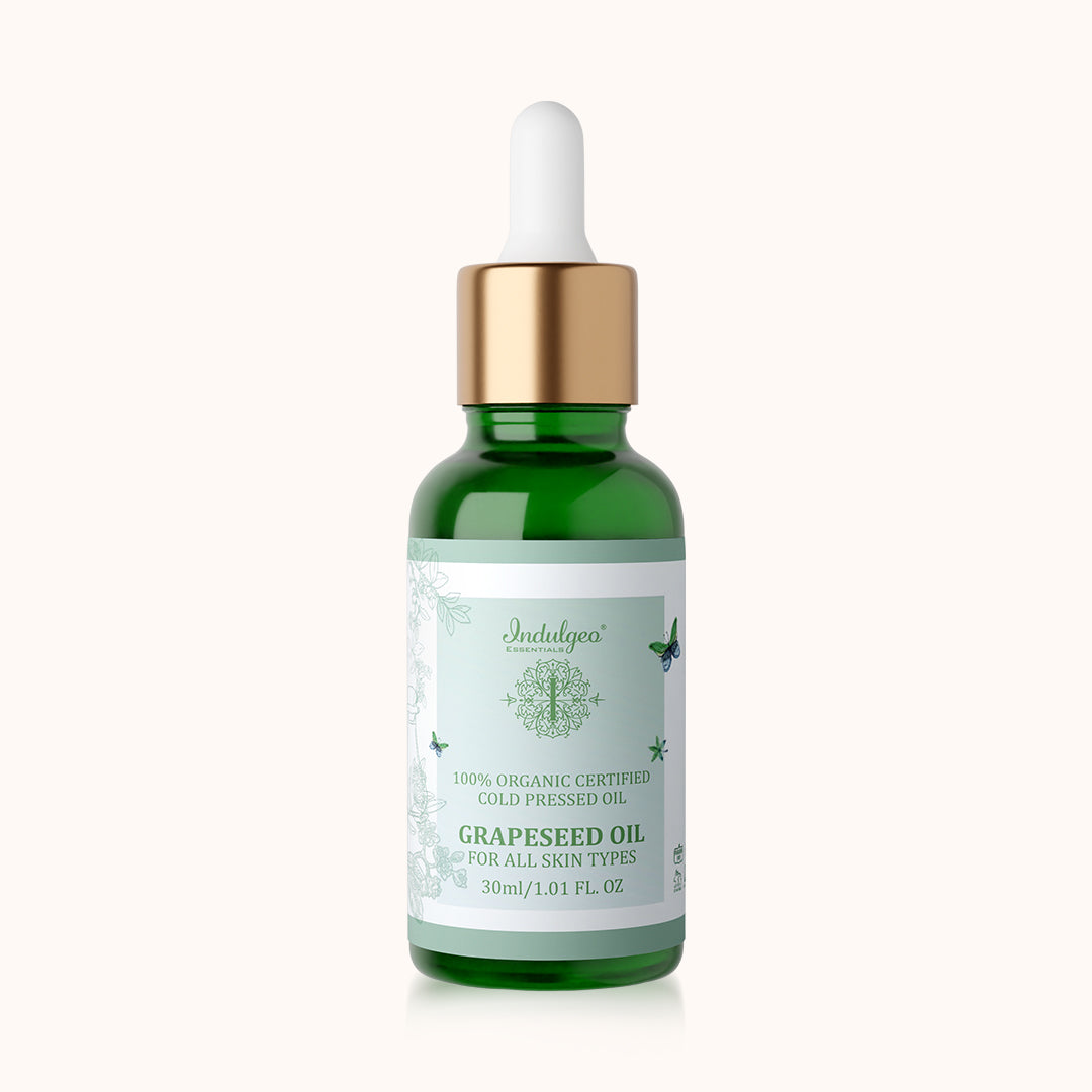 Grapeseed oil has a thin and light consistency, loaded with powerful antioxidants and natural plant compounds known as oligomeric proanthocyanidin complexes, or OPCs, Vitamin E, D & C, linolenic acid, oleic acid, omega 3, 6, 9 fatty acids, palmitic acid, stearic acid. It's anti-inflammatory properties, along with antioxidants and healthy fats, contribute significantly to healthy, youthful skin and hair. Grapeseed oil is ultra light, making it ideal for moisturizing oily skin without giving a greasy after-effect. Our Grapeseed Oil is 100% pure, unadulterated and cold pressed, allowing penetration of maximal benefits to the skin & easy absorption.