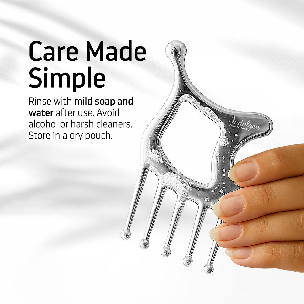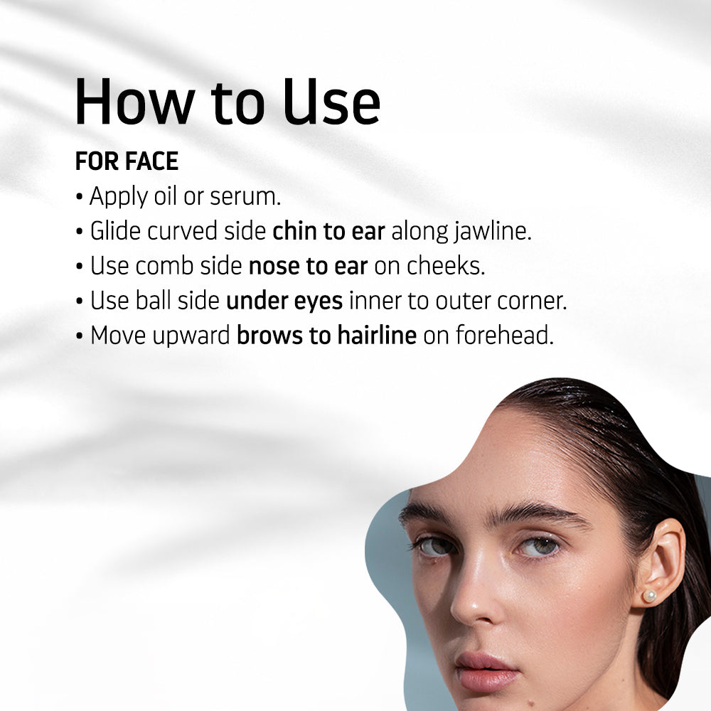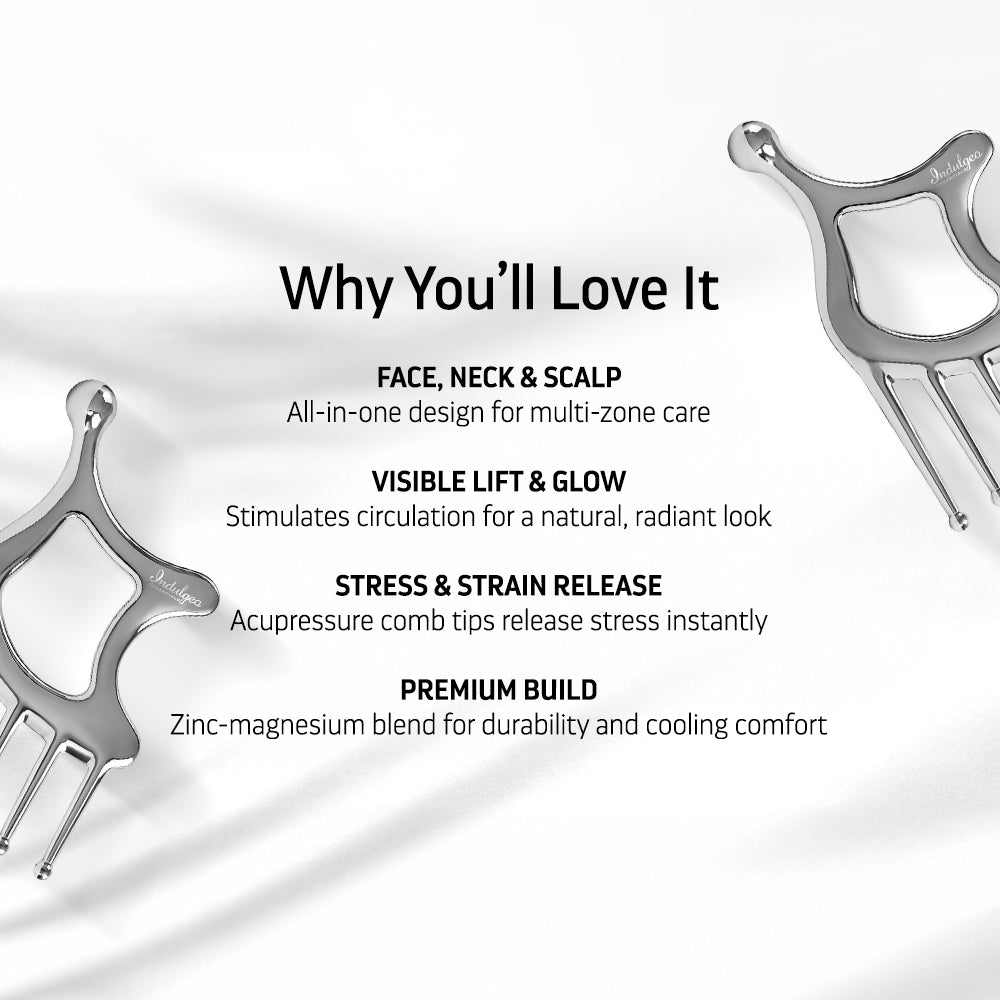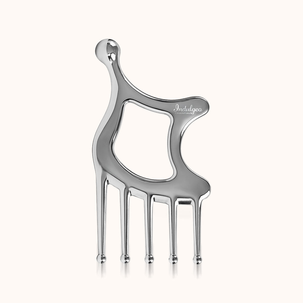 A: It’s a multi-contoured facial and scalp massage tool crafted with zinc and magnesium to lift, sculpt, and relax your skin while improving circulation and product absorption.