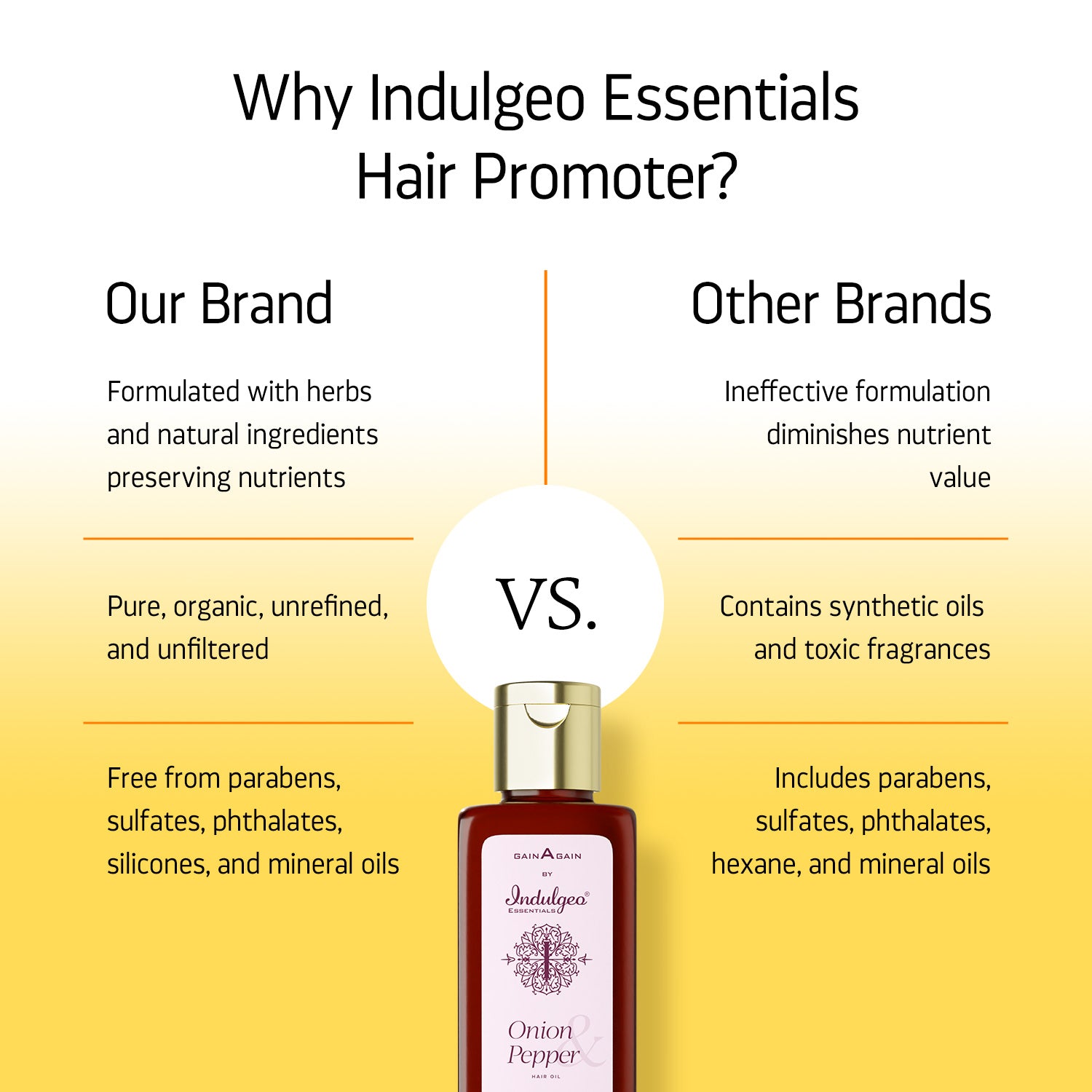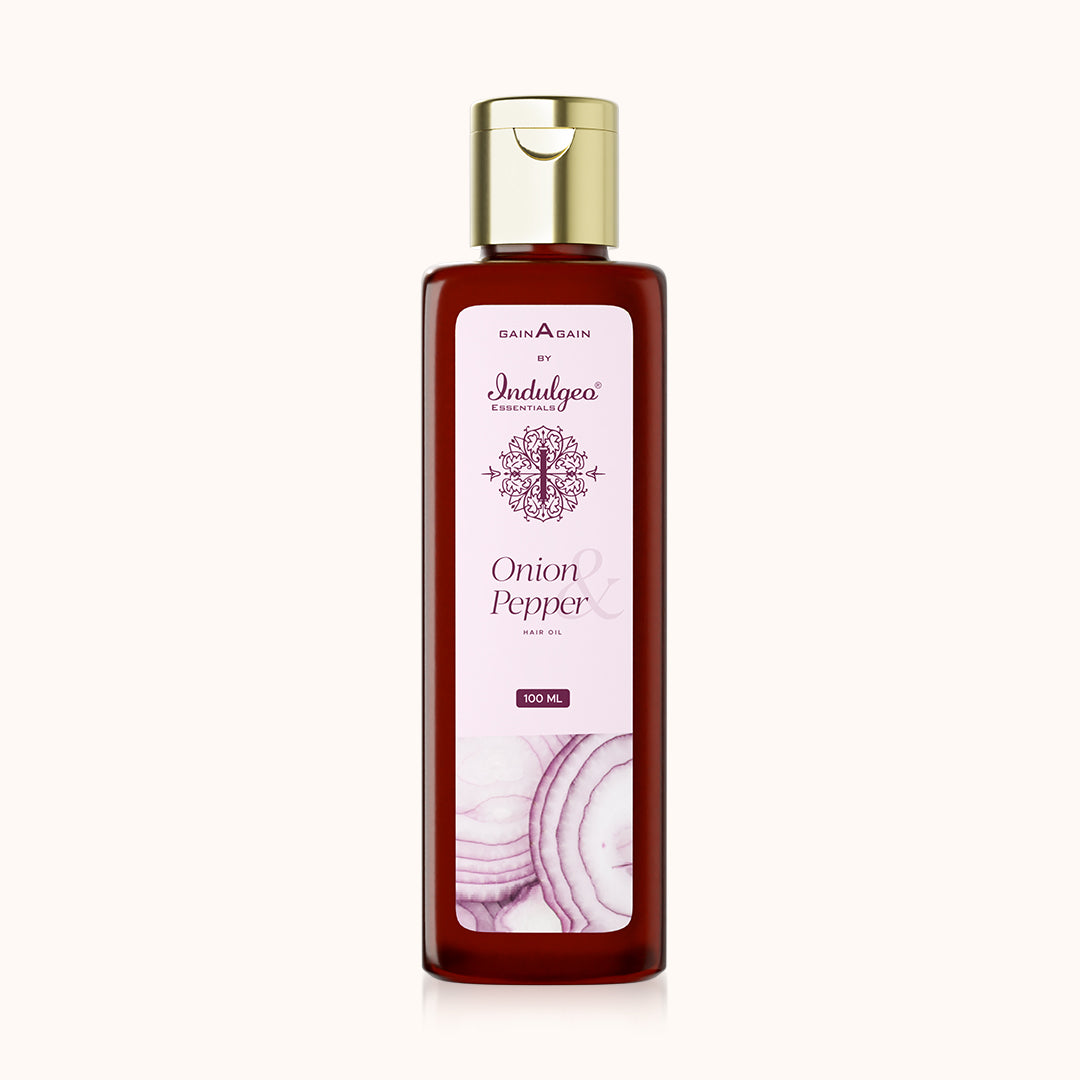 The Indulgeo Essentials Onion & Pepper Hair Oil is the miracle one bottle stress-free solution for all your hair needs & intense nourishment. Transform dead, thin & lightweight hair to strong, voluminous & gorgeous locks with this perfect blend of highly nutritious oils that complement each other to strengthen your hair from the roots to the tips with the power of pure botanically sourced ingredients like Rosemary oil, Onion extract, Black Pepper Seed oil & other 100% natural oils packed with potent vitamins & minerals that stimulate hair growth & mitigate hair loss, making your hair incredibly healthy & lusciously shiny. Onion extract is extremely rich in sulfur & antioxidants that multiply collagen production & stimulate blood circulation while keeping the scalp bacteria-free. Harness unlimited benefits with this oil & experience the power of nature!