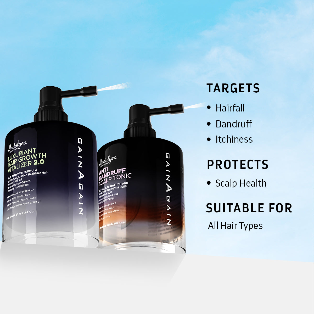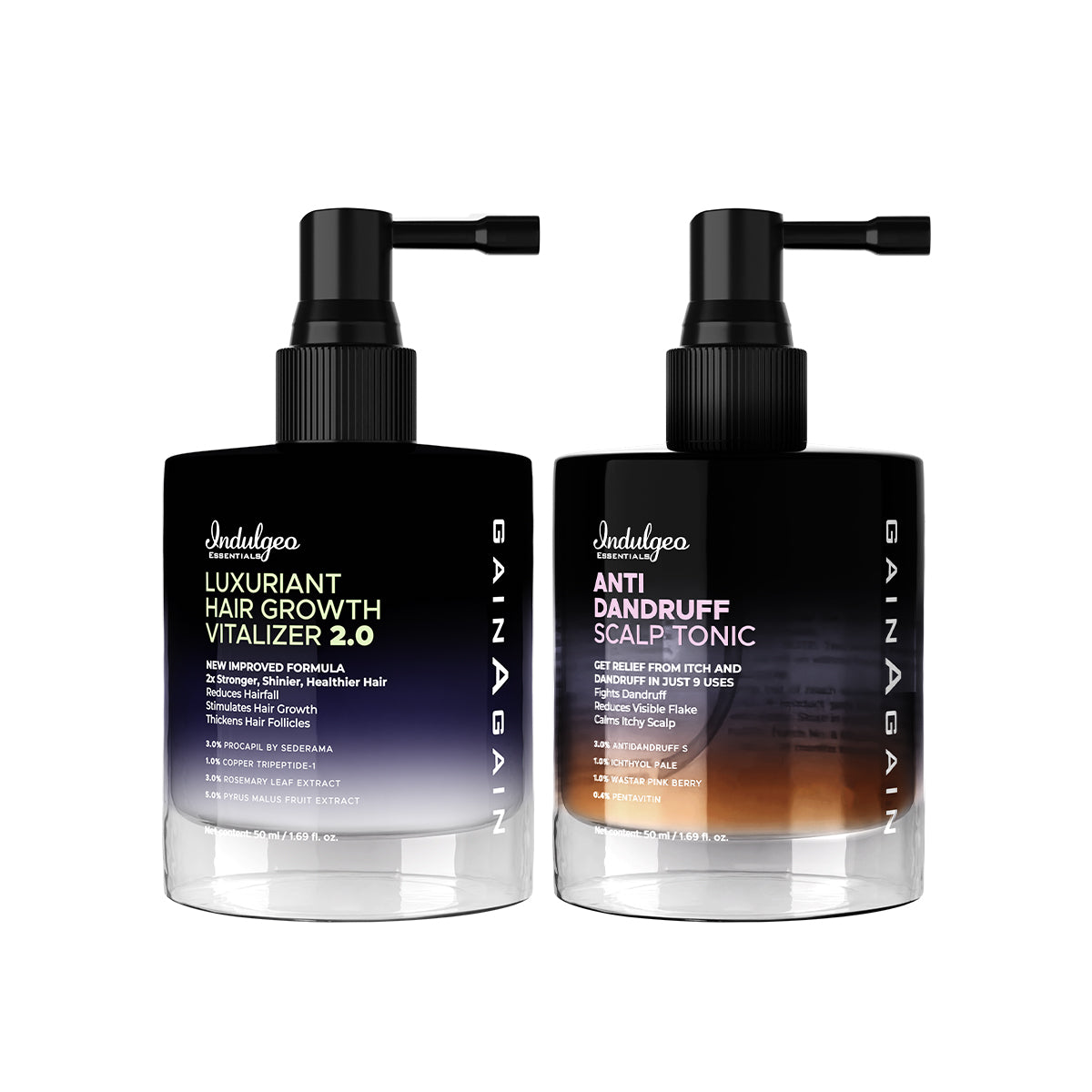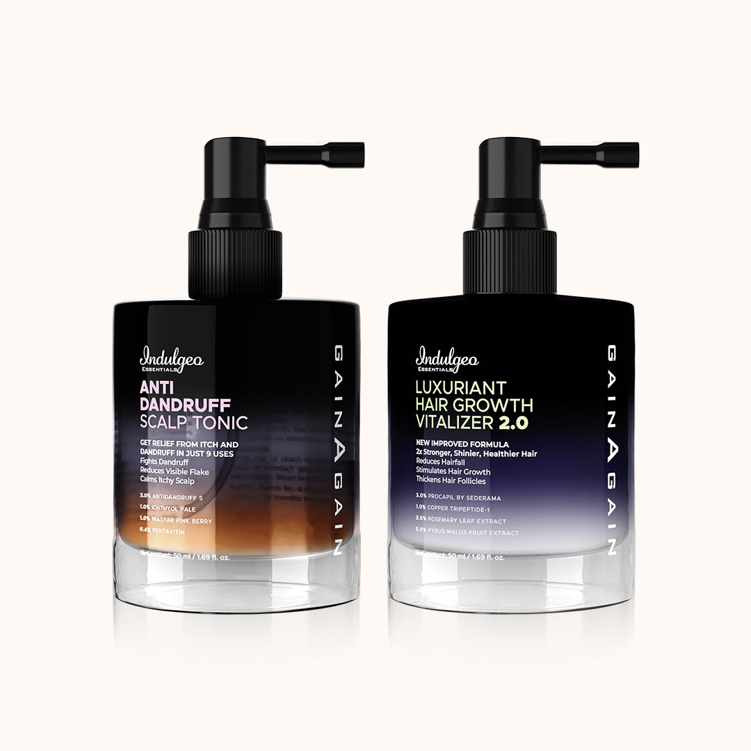 Stress, pollution & unhealthy lifestyle choices can lead to many hair troubles like hair fall, breakage, and thinning. Indulgeo Essentials Hair Growth Combo together helps to stop hair damage and nourish them deeply to repair and minimize hair fall and boosts hair growth. This premium combo consists of Indulgeo Essentials Luxuriant Hair Vitalizer and Anti Dandruff Scalp Tonic that strengthens your hair follicles and gives volume to the hair.