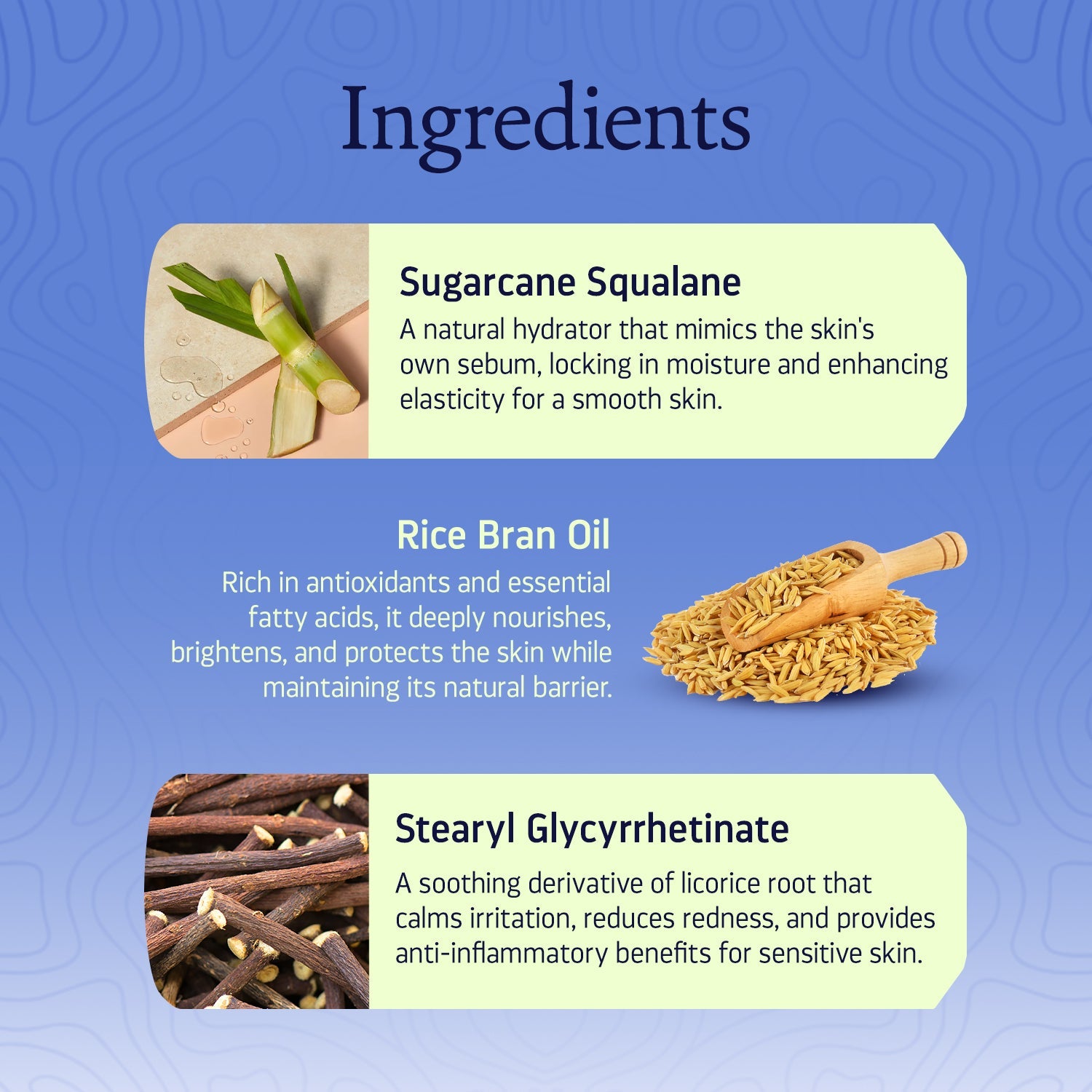 Sugarcane Squalane*, Rice Bran Oil (Oryza Sativa)*, Jojoba Oil (Simmondsia Chinensis)*, Isoamyl Laurate*, Ylang Ylang Extract (Cananga Odorata)***, Honey Suckle Extract (Lonicera)***, Sorbeth-30 Tetraoleate, Betel Leaf Extract (Piper Betel)***, Blue tansy essential oil (Tanacetum annuum L.)***, Jasmine Root Extract (Jasminum Officinale)***, Bulgarian Rose Essential Oil (Rosa x damascena Mill)*, Vitamin- E (Tocopherol)***, Almond Butter**, Stearyl Glycyrrhetinate***.