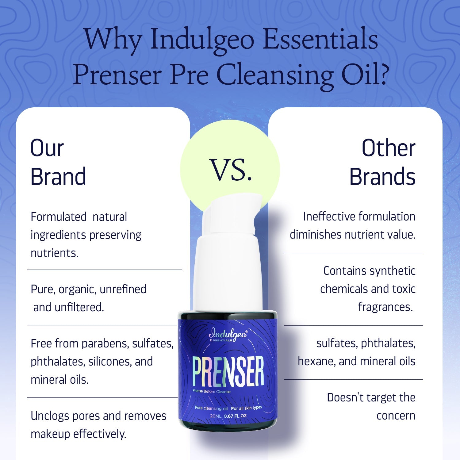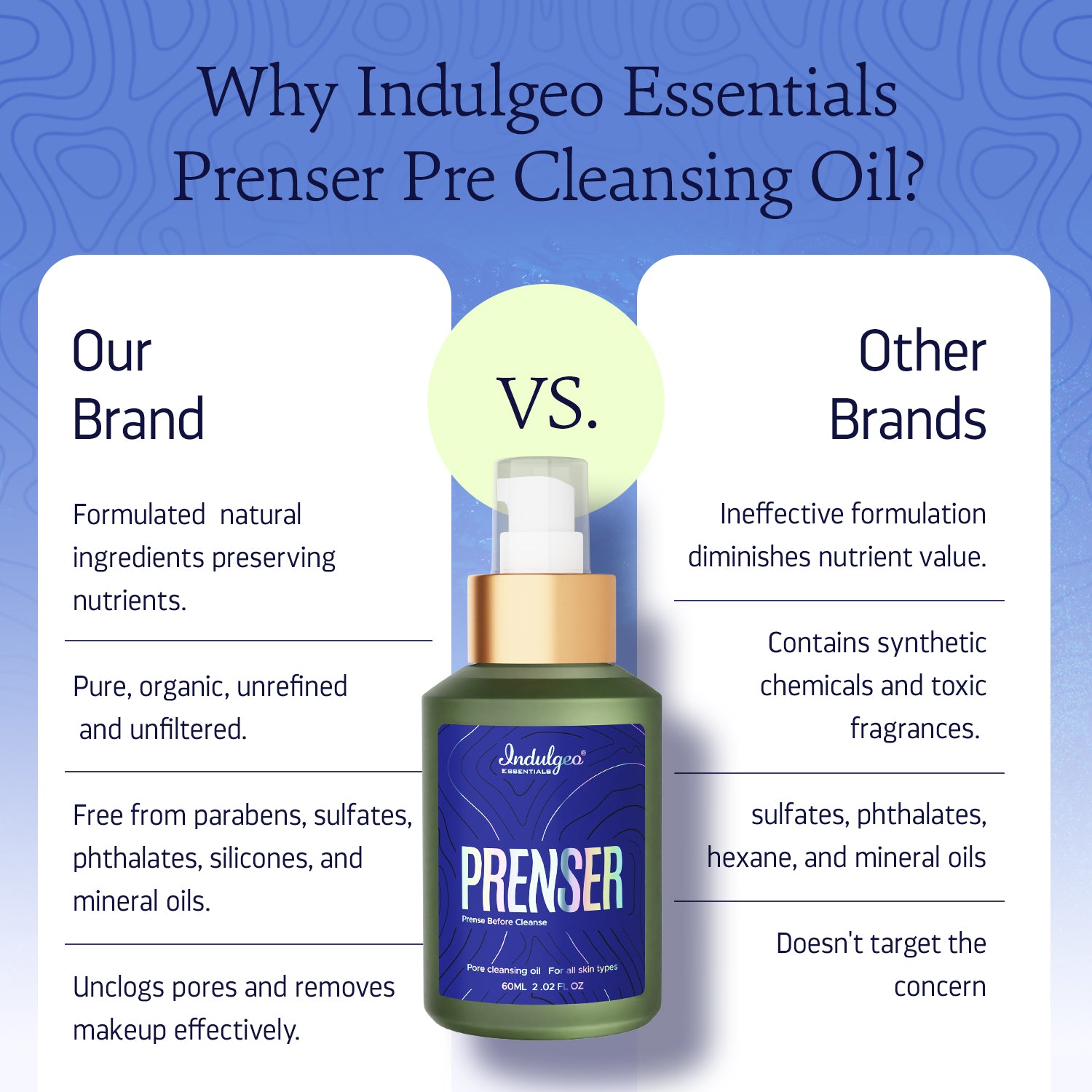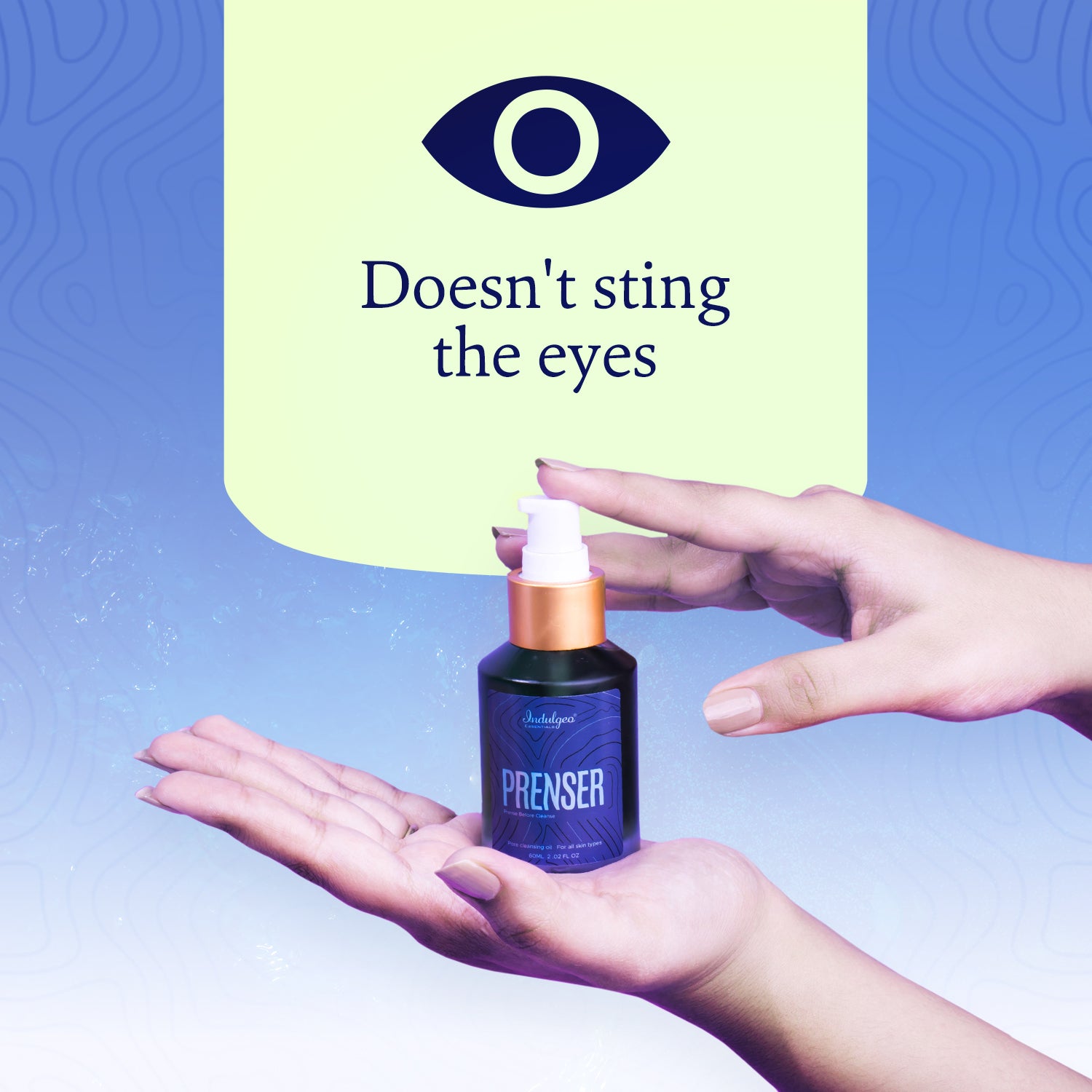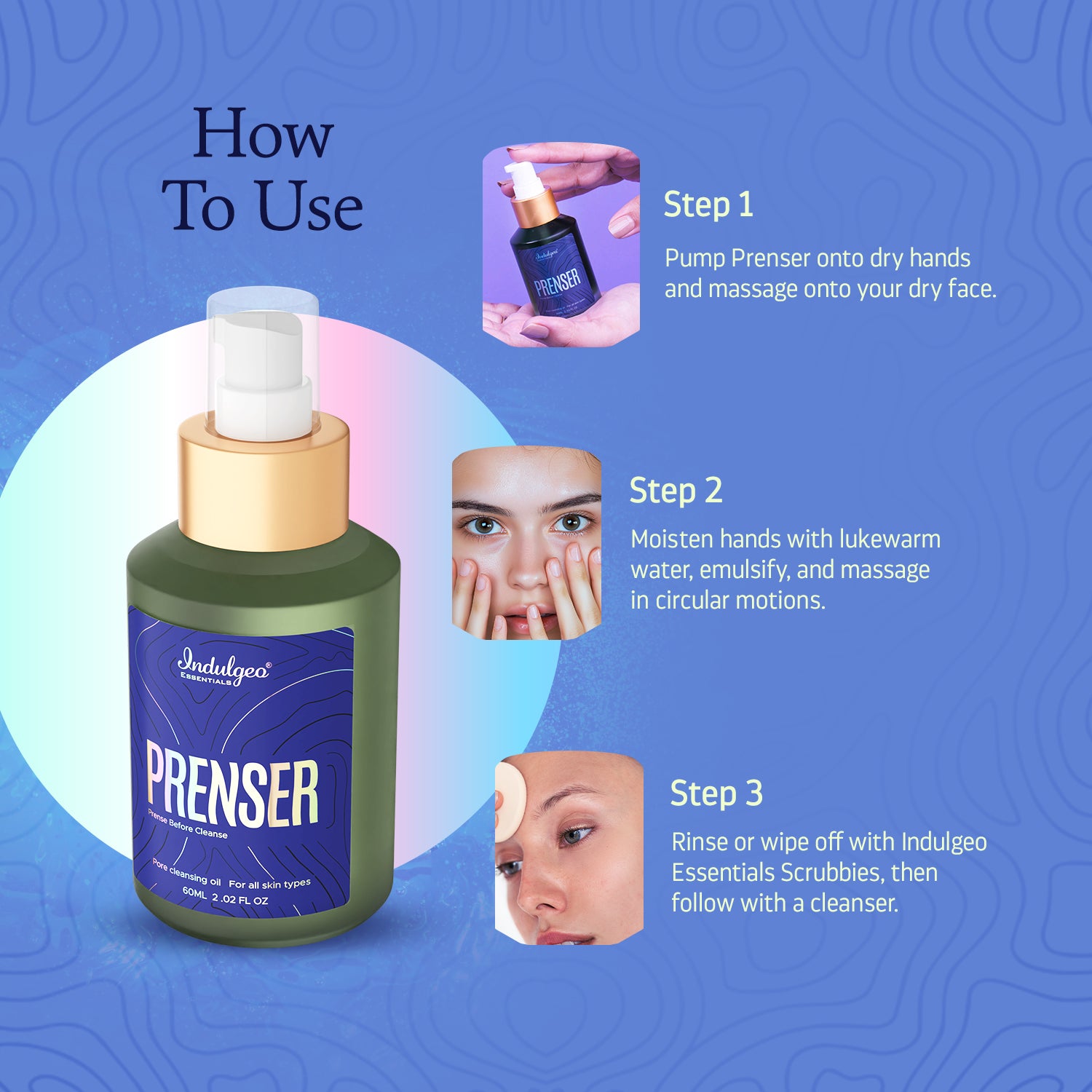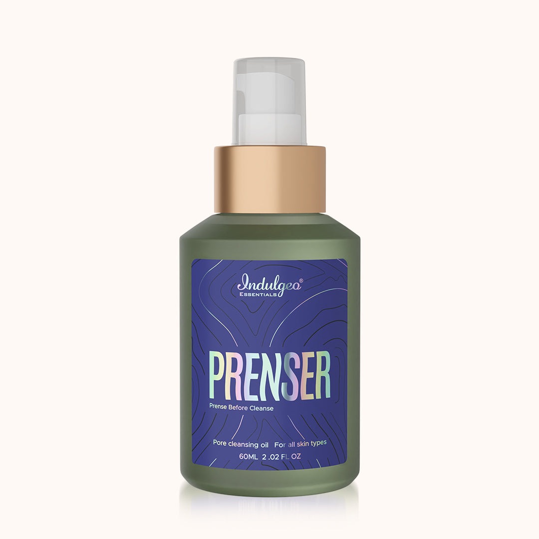 The Indulgeo Essentials Prenser is an effective cleansing oil that is gentle enough for the skin yet powerful enough to deep cleanse pores, dirt, excess sebum and other impurities. This cleansing oil is specially formulated to deep clean the skin while hydrating it, and contains a unique blend of nutritive botanical oils like Rice Bran, Blue Tansy, and Jojoba, that bind with surface sebum and other pore-clogging impurities, effortlessly annihilating them. This refreshingly light formula moisturizes the skin due to the presence of HoneySuckle Extract and Almond Butter, while cleansing it without stripping the skin of its natural moisture. It also helps soften the impurities and congestion for easier removal, consequently reducing the appearance of blackheads and open pores. The astringent, anti- bacterial and anti- inflammatory qualities help soothe irritated skin and soak up excess oil and bacteria from the pores thereby enabling these to shrink, and eventually healing acne. The extraordinaire ingredients of this cleansing oil work individually and in unison to maintain the youthfulness of the skin by bestowing antioxidant benefits that include protection from the damage caused by free radicals, increasing skin elasticity and also boost the production of collagen. Packed with natural hydrators, this product also locks gorgeous benefits for your beauty quotient, brightening and toning your skin to provide a radiant glow. This is a non-abrasive product that is gentle enough for everyday use on all types of skin and leaves the skin balanced, soft, and revitalized after each use.