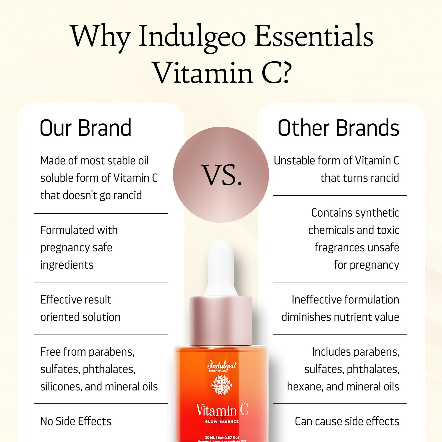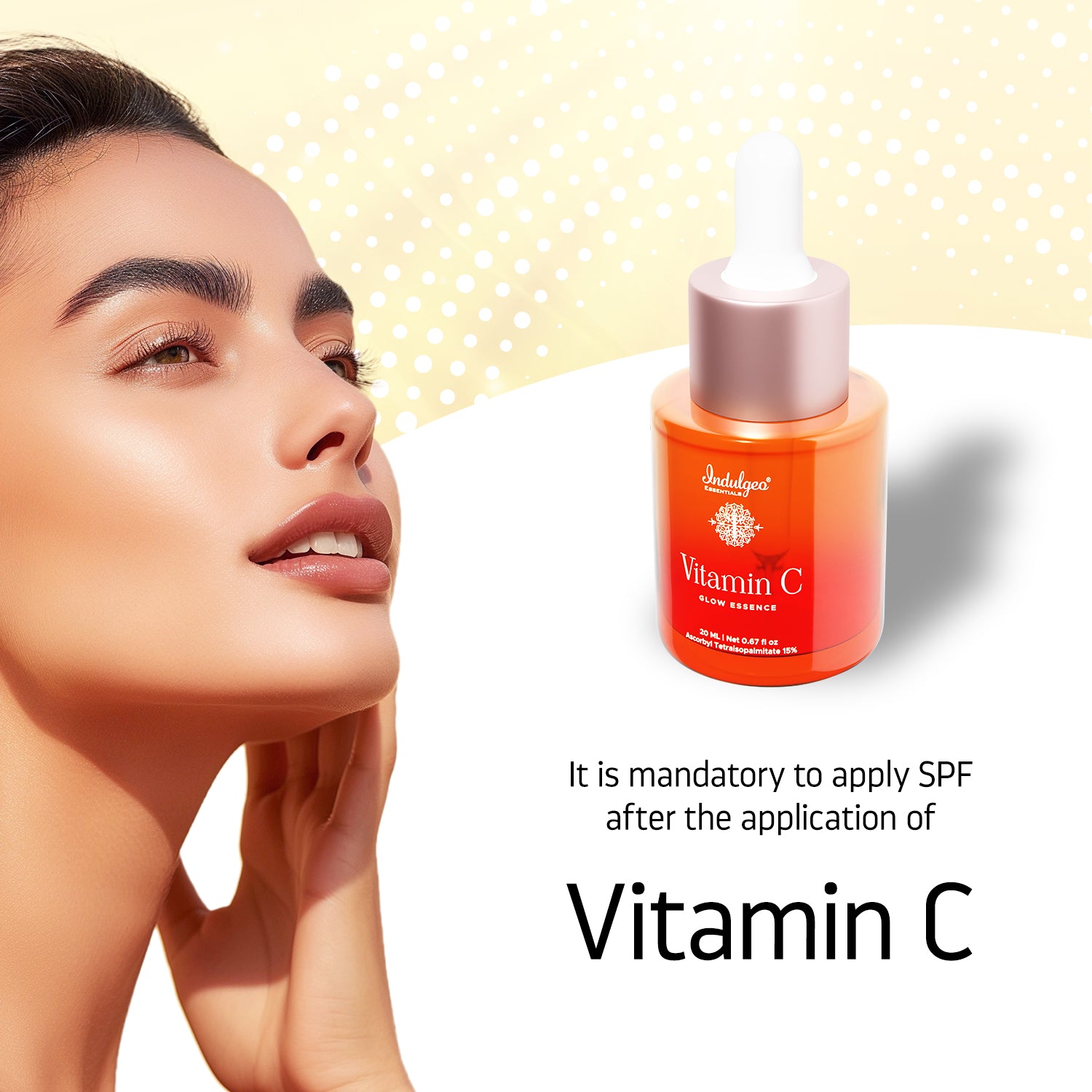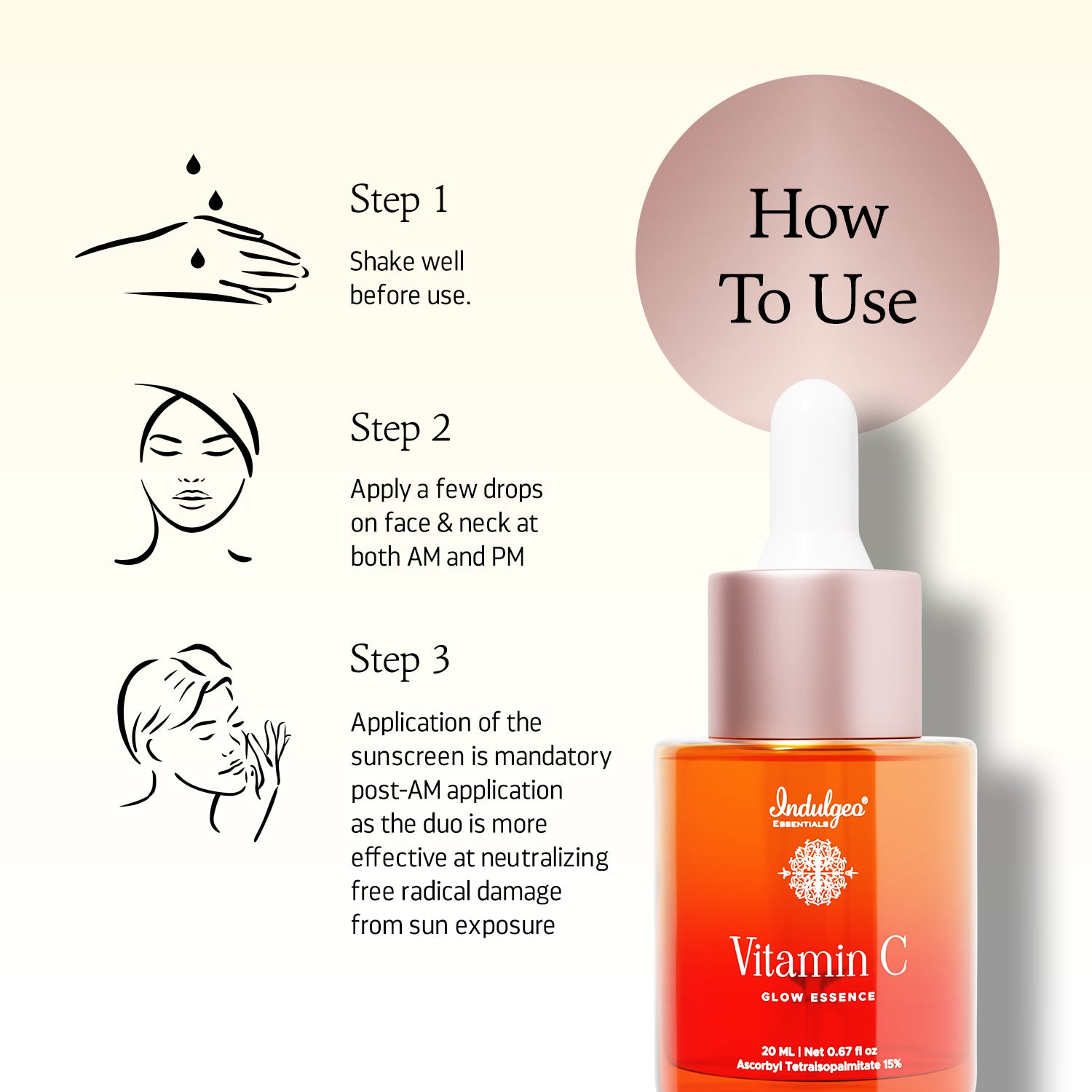 Glow brighter than the sun with the Indulgeo Essentials Vitamin C Glow Essence. Lock in eternal healthy radiance with Vitamin C through Ascorbyl Tetraisopalmitate, an oil-soluble derivative of Vitamin C that beautifully brightens, supremely smooths and excellently enhances your skin texture while fighting dark spots and discoloration. This active-rich serum is gentle enough for all skin types and provides nourishment to the deepest levels of your skin as Ascorbyl Tetraisopalmitate, the most stable form of Vitamin C. It amalgamates with the skin's natural barrier to slip into your skin faster than any other water-based Vitamin C products.
